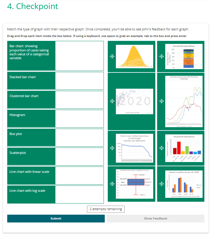 Checkpoint: This type of activity appears at the end of every module and is usually a substantial activity that tests learners’ knowledge of the whole module. The checkpoint can include a variety of exercise types.